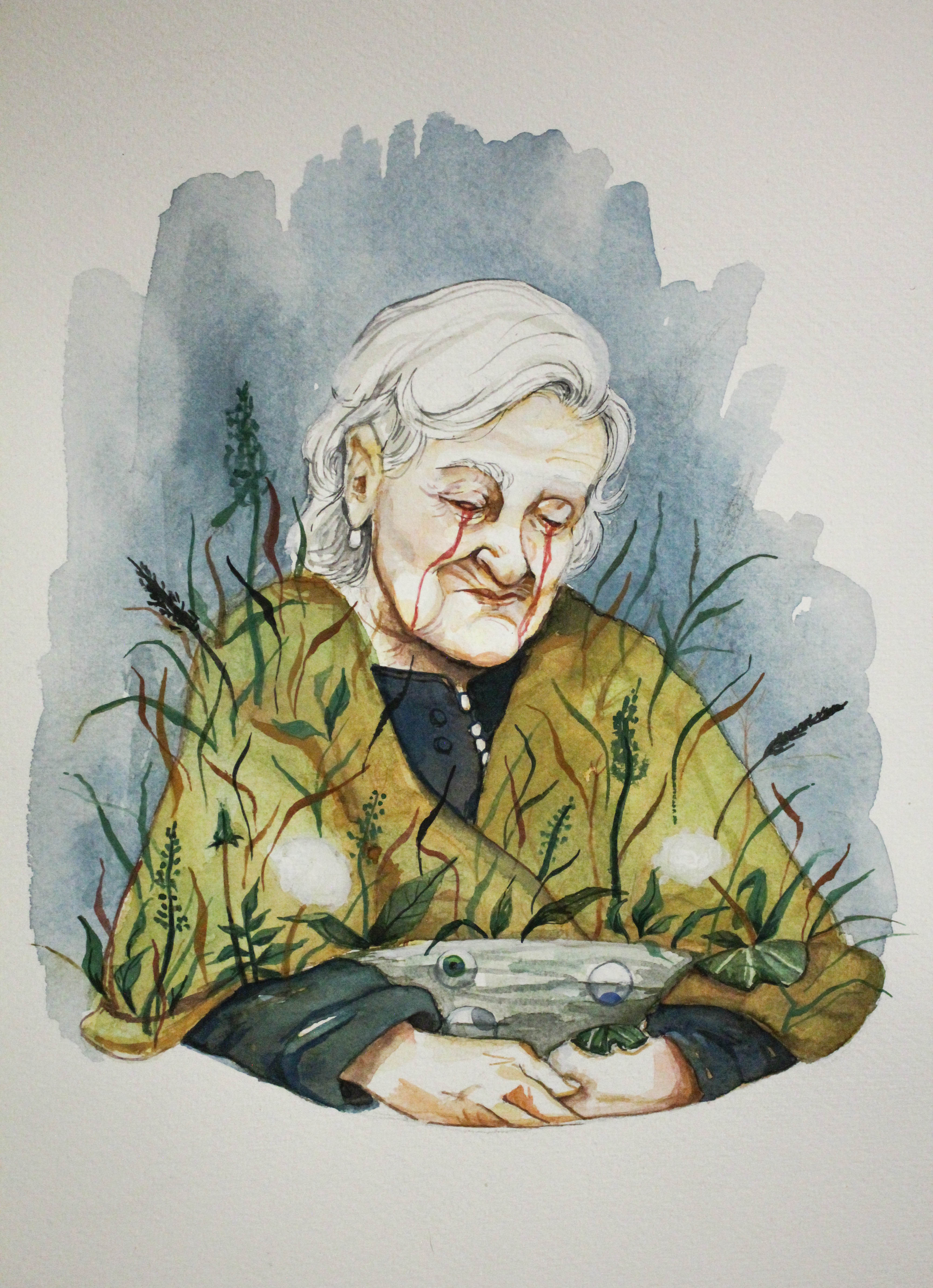 La galería de Ilse Ovalle se compone de nueve piezas, en formato pequeño. Inerte es la obra que habla del cuento “Tiempo Destrozado”, fue realizada en acuarela y acrílico sobre papel.