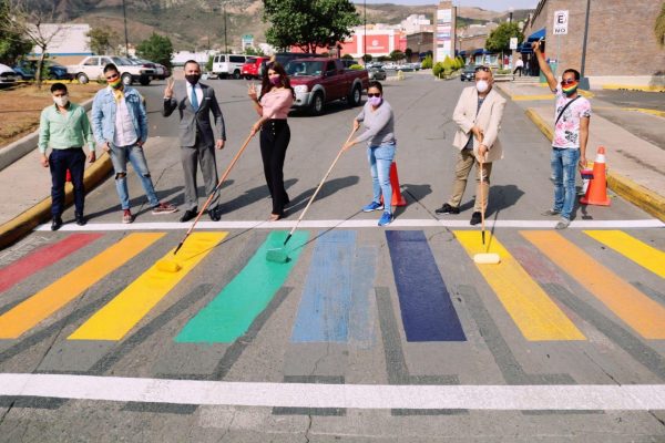 Zacatecas, Zac.- Como parte de las actividades conmemorativas por el mes del orgullo LGBTTTIQ+ en el municipio de Zacatecas y respetando los debidos protocolos de sanidad que derivan de la contingencia por el COVID-19, se llevó a cabo la pinta del paso peatonal sobre la Avenida García Salinas con los colores de la bandera que representa a este sector de la sociedad, y que ha sido utilizada como símbolo desde los años 70.