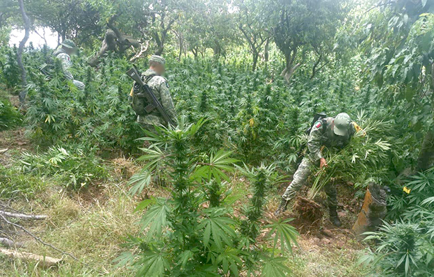 Por lo que tras su localización se procedió con la destrucción por mano de obra e incineración de los plantíos de marihuana.