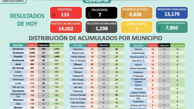 Zacatecas, Zac.- Al registrar 133 nuevos contagios este día, Zacatecas acumuló un total de 14 mil 002 casos positivos de Coronavirus (COVID-19), informó el titular de la Secretaría de Salud estatal (SSZ), Gilberto Breña Cantú.