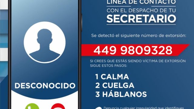 Zacatecas, Zac.- La Secretaría de Seguridad Pública de Zacatecas (SSP) alerta sobre otra modalidad de extorsión, a través de llamadas del número 449 980 9328, en las que aseguran ser de un grupo delincuencial que tiene presencia en municipios de la zona sur del estado y exigen el pago de cierta cantidad de dinero a cambio de protección y no dañar a las personas y sus familias.