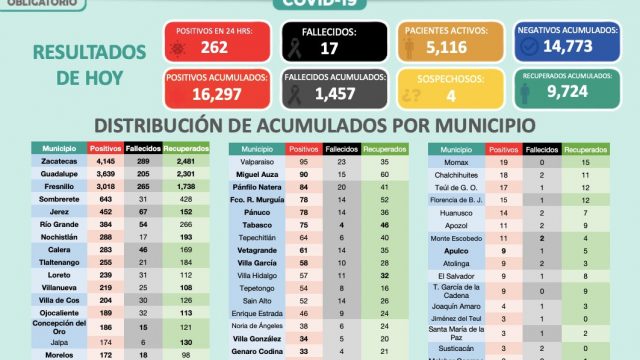Zacatecas, Zac.- Este viernes, 262 nuevos contagios se suman a los casos positivos de Coronavirus (COVID-19) en Zacatecas, para un acumulado de 16 mil 297, informó el Secretario de Salud de Zacatecas, Gilberto Breña Cantú.