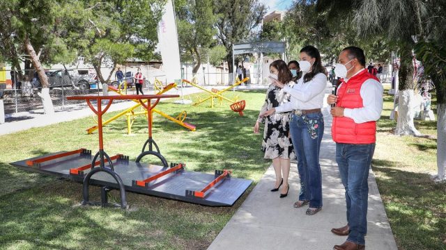 Pinos, Zac.-Acompañada por el alcalde, Herminio Briones Oliva, Cristina Rodríguez de Tello, presidenta honorífica del Sistema Estatal para el Desarrollo Integral de la Familia (SEDIF), entregó en Pinos el décimo parque inclusivo Espacio DIFerente que el Gobierno de Zacatecas construye en la entidad.