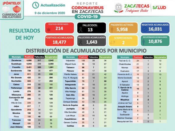 Zacatecas tiene 214 nuevos casos de Covid-19 este miércoles
