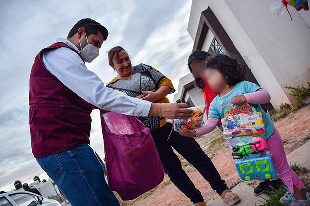 Zacatecas, Zac.- Con todas las medidas de sana distancia y prevención, Julio César Chávez Padilla visita casa por casa a las familias guadalupenses con un mensaje de esperanza y alegría para niños y adultos en esta época decembrina, además de entregar bolos y regalos.