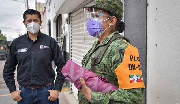 En compañía del Ejército Mexicano se recorren los comercios para reforzar las medidas de prevención para evitar contagios de Covid-19.