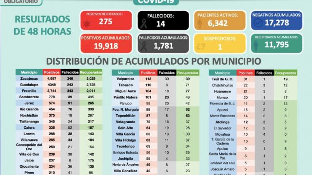 Fresnillo está a la cabeza en el número de nuevos contagios con 52; Zacatecas tiene 51; Guadalupe, 50; 37 en Jalpa; Sombrerete, 21; 10 en Calera; nueve en Nochistlán; Concepción del Oro y Jerez contabilizan ocho, respectivamente; Pinos y Tabasco, seis cada uno; cuatro en Ojocaliente y el mismo número en Villanueva.