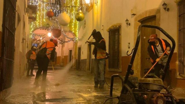 Zacatecas, Zac.- Como parte de los trabajos permanentes del Ayuntamiento de Zacatecas, el alcalde capitalino Ulises Mejía Haro continúa impulsando las acciones de limpieza y mantenimiento del Centro Histórico y sus emblemáticos callejones.