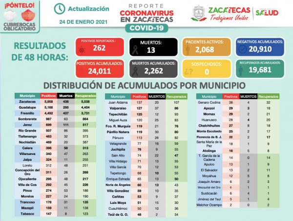 Zacatecas, Zac.- Zacatecas cierra la semana con 262 nuevos casos del Coronavirus (COVID-19) presentados en las últimas 48 horas; con ellos, la entidad alcanza 24 mil 011 contagios, informó el Secretario de Salud estatal, Gilberto Breña Cantú.