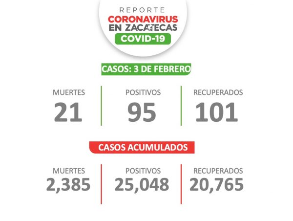 Las cuatro últimas defunciones corresponden a un hombre de Monte Escobedo, sin comorbilidades de 77 años; un guadalupense de 71 años diabético e hipertenso; una mujer de Zacatecas de 57 años quien murió el 14 de enero y una mujer de Morelos de 82 años quien murió el 26 de enero, las dos últimas no presentaban comorbilidades.
