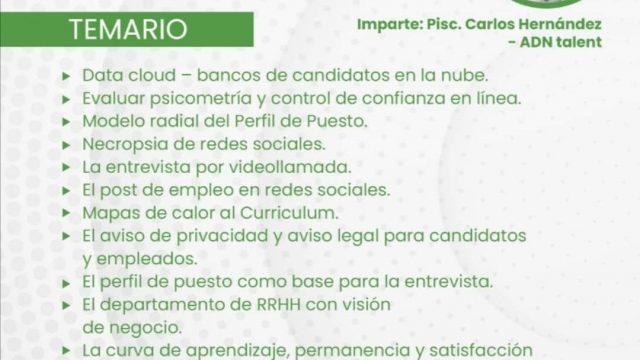 A algunos de los temas que abordaran son: Modelo Radial del Perfil del puesto, Necropsia de Redes Sociales, La entrevista por video llamada y Relaciones Laborales más tóxicas que tu ex.