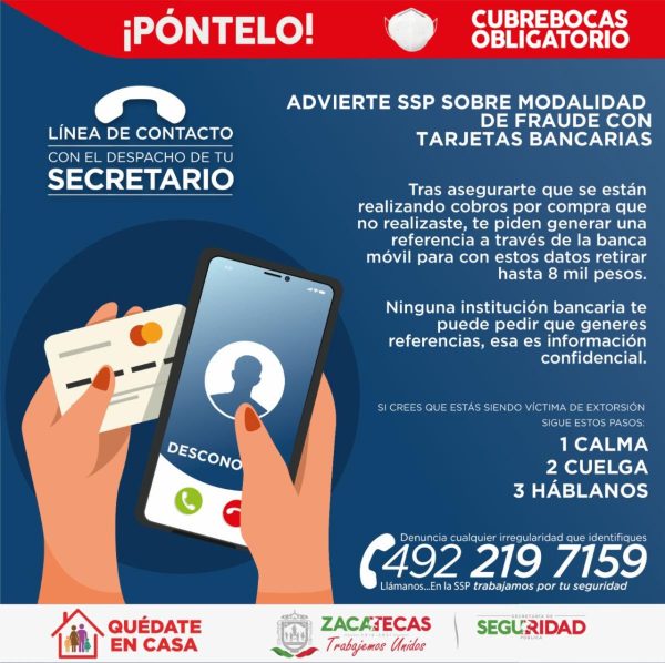 Zacatecas, Zac.- El Gobierno del Estado, a través de la Secretaría de Seguridad Pública (SSP), solicita a la población zacatecana a mantenerse en alerta y evitar ser víctimas del delito de fraude, ya que se ha detectado que, mediante llamadas y mensajes de texto, solicitan datos de la tarjeta bancaría para después extraer cierta cantidad en efectivo.