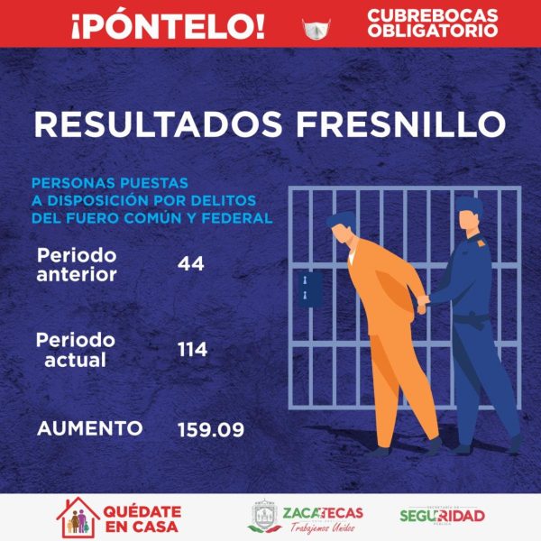 De acuerdo con estadísticas de la Dirección de Seguridad Pública del Municipio de Fresnillo, desde el 21 de octubre de 2020, cuando se dio el nombramiento del nuevo Director de Seguridad Municipal, se ha presentado un incremento superior al 150 por ciento en el número de detenciones por delitos del fuero común y fuero federal, con lo que se arrojan buenos resultados.