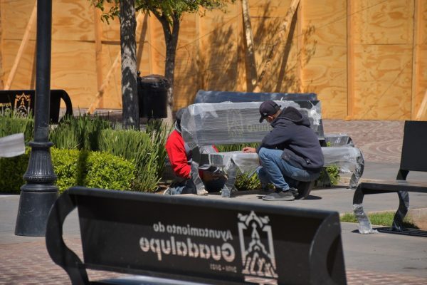 Zacatecas, Zac.- Personal de la Dirección de Obras Públicas del Ayuntamiento de Guadalupe sustituyeron la totalidad de bancas del Jardín Juárez, compromiso adquirido con los comerciantes de la zona previo a la contingencia sanitaria por Covid-19.