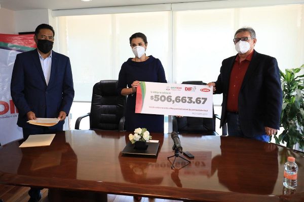 Zacatecas, Zac.- En el marco del convenio de colaboración de Dos al Millar entre el Gobierno del Estado, el Sistema Estatal para el Desarrollo Integral de la Familia (SEDIF) y la Cámara Mexicana de la Industria de la Construcción (CMIC), delegación Zacatecas, fue entregado el tercer cheque de dicha retención que se realiza por la construcción de obras de infraestructura en el estado.