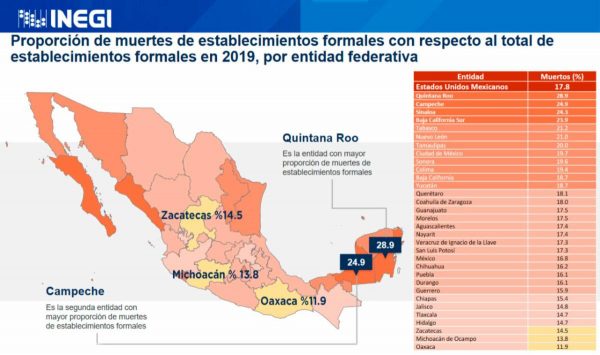 Zacatecas, Zac.- El Secretario de Economía, Carlos Bárcena Pous, informó que, de acuerdo al Instituto Nacional de Estadística Geografía e Informática (Inegi), Zacatecas destaca entre los tres mejores estados del país que ha presentado la menor muerte de empresas formales durante la contingencia de salud por COVID-19. Únicamente es superada por Michoacán y Oaxaca.