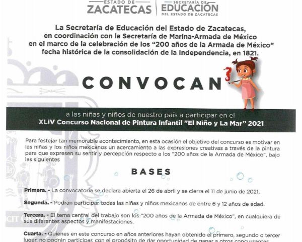 Zacatecas, Zac.- Las secretarías de Educación y de Marina-Armada de México, convoca a las niñas y niños a participar en la edición número 44 del Concurso Nacional de Pintura Infantil El Niño y La Mar 2021, que busca motivar su acercamiento a las expresiones creativas para que expresen su sentir y percepción respecto a los 200 años vida de la Armada de México.