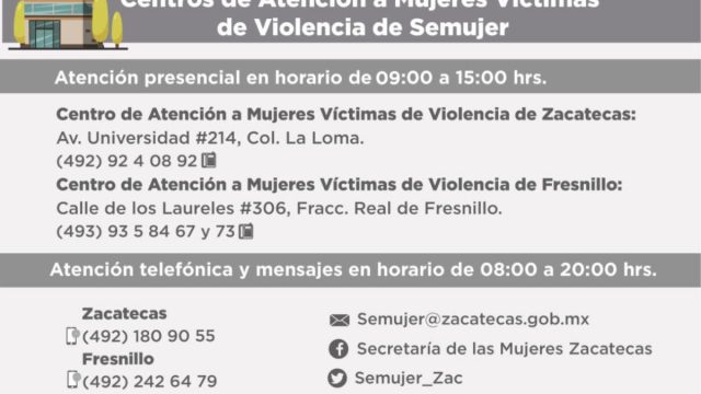 Los Centros de Atención a Mujeres Víctimas de Violencia (CAMVV) cuentan con atención presencial de lunes a viernes en horario de 9:00 a 15:00 horas, en los siguientes domicilios: en Fresnillo, calle de los Laureles #306, Fracc. Real de Fresnillo y en Zacatecas, Av. Universidad #214, Col. La Loma.