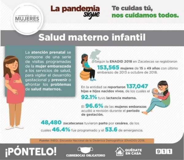 Zacatecas, Zac.- La Secretaría de las Mujeres estatal (Semujer) invita a las madres zacatecanas a acercarse a la dependencia y las autoridades correspondientes a conocer sobre la importancia de la salud materna, a fin de atenderlas en todos los aspectos, desde el embarazo hasta el posparto, y así evitar complicaciones.