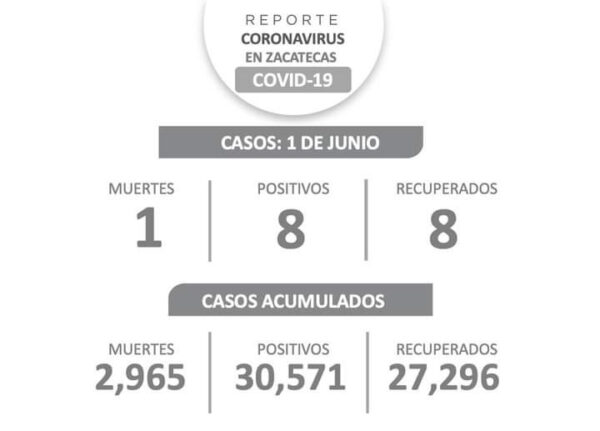 Este martes, Zacatecas alcanzó los 30 mil 571 casos acumulados del Coronavirus (COVID-19), con el reporte, en las últimas 24 horas, de ocho nuevos contagios. Además, la Secretaría de Salud estatal dio a conocer que, por este virus, falleció una persona y se recuperaron ocho más.