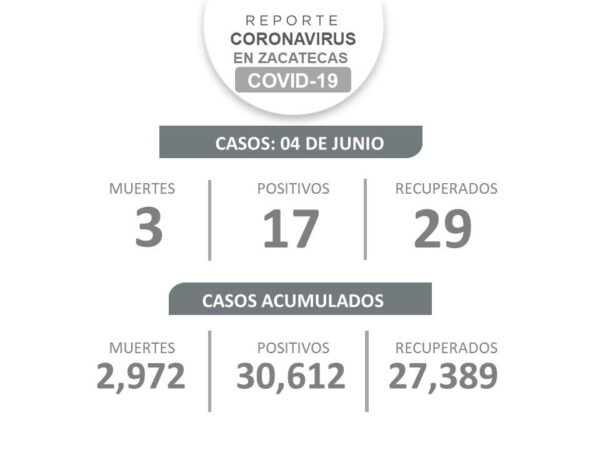 Zacatecas, Zac.- La Secretaría de Salud de Zacatecas (SSZ) registra este viernes en el estado 17 nuevos contagios de COVID-19, tres muertes y 29 personas recuperadas. El acumulado de zacatecanas y zacatecanos que han adquirido el Coronavirus sube a los 30 mil 612.