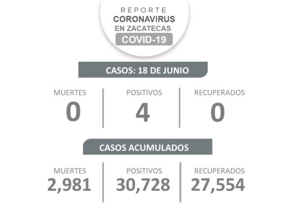 Zacatecas, Zac.- La Secretaría de Salud de Zacatecas (SSZ) informó que, este viernes, no se registraron defunciones, ni pacientes recuperados de COVID-19; sólo se reportaron cuatro nuevos contagios.
