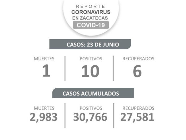 El reporte de la Secretaría además informa de la recuperación de seis zacatecanas y zacatecanos (cinco mujeres y un hombre) de entre 26 y 54 años. Dos son del municipio de Fresnillo, dos de Guadalupe, uno de Zacatecas y otro de Vetagrande. Todos fueron atendidos en el IMSS y permanecieron en aislamiento domiciliario.