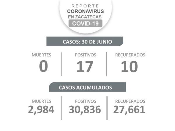 A la fecha, el número de casos positivos acumulados es de 30 mil 836. En esta ocasión son nueve mujeres y ocho hombres habitantes de Guadalupe (6), Zacatecas (5), Fresnillo (3), Concepción del Oro, Jerez y Sombrerete; dos están graves, dos están estables y el resto enfrenta el virus en su hogar.