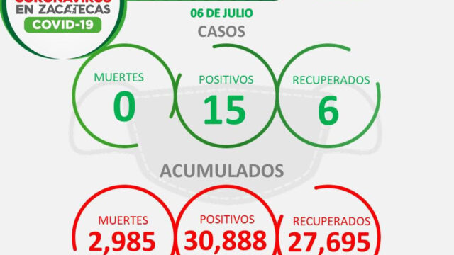 Zacatecas, Zac., 6 de julio de 2021.- De acuerdo con el reporte de la Secretaría de Salud de Zacatecas (SSZ), este martes, 15 personas resultaron positivas a COVID-19; seis se recuperaron y no se registró ninguna defunción. En total, se han contagiado 30 mil 888 zacatecanos, de los cuales 27 mil 695 se recuperaron.