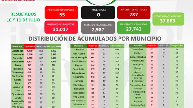 De ellos, 18 fueron detectados por la SSZ, siete por el Instituto Mexicano del Seguro Social (IMSS), dos por el ISSSTE y dos por el IMSS Bienestar; siete son habitantes de Guadalupe, seis de Zacatecas, cinco de Jerez, dos de Fresnillo, dos de Tlaltenango y el resto de Calera, Loreto, Trancoso, Francisco R. Murguía, Tepetongo, Enrique Estrada y Genaro Codina.