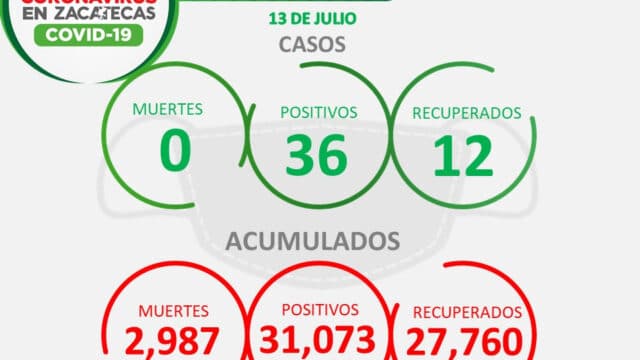 Zacatecas, Zac.- Nuevamente, este martes, la Secretaría de Salud de Zacatecas (SSZ) no reporta muertes por COVID-19. Este día son 36 nuevos casos positivos y 12 personas las recuperadas de la enfermedad.