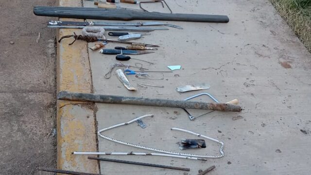 11 teléfonos celulares, dos chips para celular, 13 cargadores para celular, cinco manos libres para celular, 11 pipas, 26 cuchillos, 15 puntas, una tijera quirúrgica, una tabla, dos tubos y cuatro varillas.