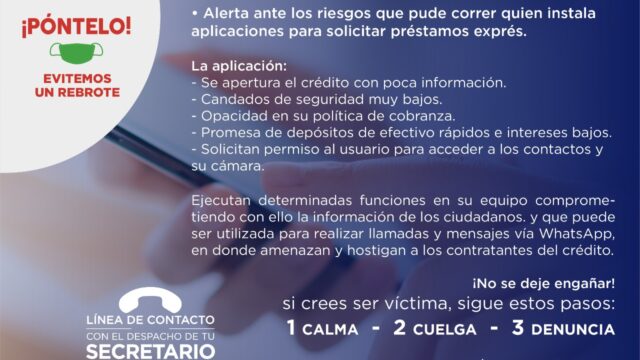 Luego de recibir llamadas mediante la Línea de Contacto con el Despacho de tu Secretario para denunciar el hostigamiento por parte de instituciones crediticias, la SSP pone en alerta a la sociedad sobre el riesgo al que están expuestos al descargar estas aplicaciones y solicitar dichos préstamos económicos.
