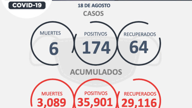 Zacatecas, Zac.- De acuerdo al reporte de la Secretaría de Salud de Zacatecas (SSZ), 174 personas dieron positivo a COVID-19; 64 lograron recuperarse y lamentablemente perdieron la vida seis más. Desde el inicio de la pandemia en la entidad, se han contagiado 35 mil 901 personas, se han recuperado 29 mil 116 y 3 mil 89 fallecieron.