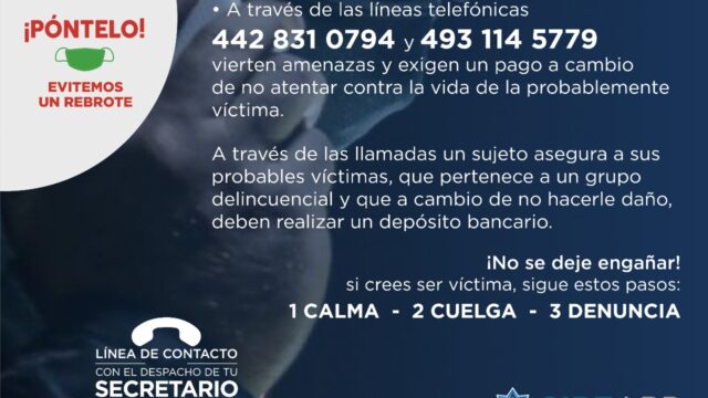 Por medio de una denuncia vertida a través del Sistema de Emergencia 911 y la Línea de Contacto con el Despacho de tu Secretario, se informó que a través de las líneas telefónicas 442 831 07 94 y 493 114 57 79, un sujeto asegura ser integrante de un grupo delincuencial y si no hacen un depósito bancarios atentará contra la vida de las probables víctimas.