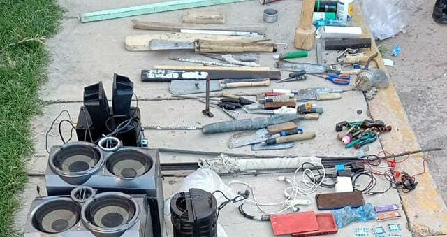 El resultado fue el aseguramiento de: un celular, seis paquetes de una sustancia similar a la droga conocida como piedra, ocho paquetes que contenían polvo blanco con carácter de probable cocaína, cinco cargadores para celular, tres manos libres para celular, 19 pipas hechizas, 18 cuchillos hechizos, 14 puntas, cinco tablas para golpear, cinco aerosoles, un perfume, seis bocinas, una memoria USB y unas tijeras.