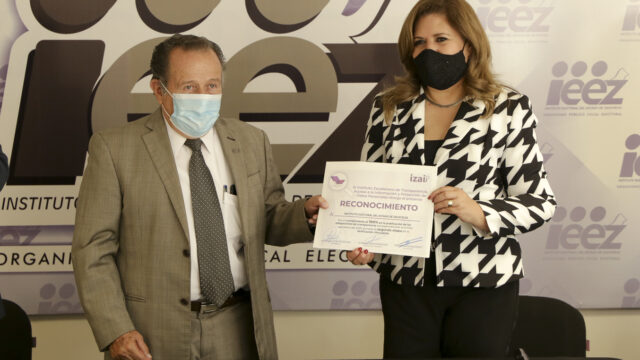 Zacatecas, Zac.- El Pleno del Instituto Zacatecano de Transparencia, Acceso a la Información y Protección de Datos Personales otorgó un reconocimiento al Instituto Electoral del Estado de Zacatecas por el cumplimiento del 100 por ciento en la publicación de las obligaciones de transparencia correspondientes al primer semestre del año 2021. El IEEZ defiende la democracia y está comprometido con la transparencia, señaló la Presidenta del IZAI, Mtra. Gilda Fabiola Torres Rodríguez.