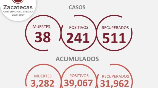 Las muertes fueron registradas en Zacatecas (3), Fresnillo (2), Genaro Codina, Nochistlán, Ojocaliente, Sombrerete y Teúl de González Ortega. El acumulado total de muertes por COVID-19 es de 3 mil 282.
