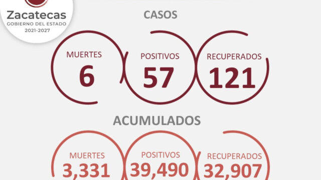 Zacatecas, Zac.- Este día, la Secretaría de Salud de Zacatecas (SSZ) reportó seis fallecimientos y 57 nuevos contagios de COVID-19, así como 121 personas dadas de alta tras superar la enfermedad.