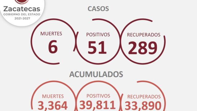Zacatecas, Zac.-Este martes, la entidad tiene 51 nuevos contagios de COVID-19, con lo cual, la cifra de acumulados es de39 mil 811 casos positivos. De acuerdo a las actualizaciones del reporte de la Secretaría de Salud de Zacatecas (SSZ) también hay seis decesos más y 289 zacatecanos recuperados de la enfermedad.