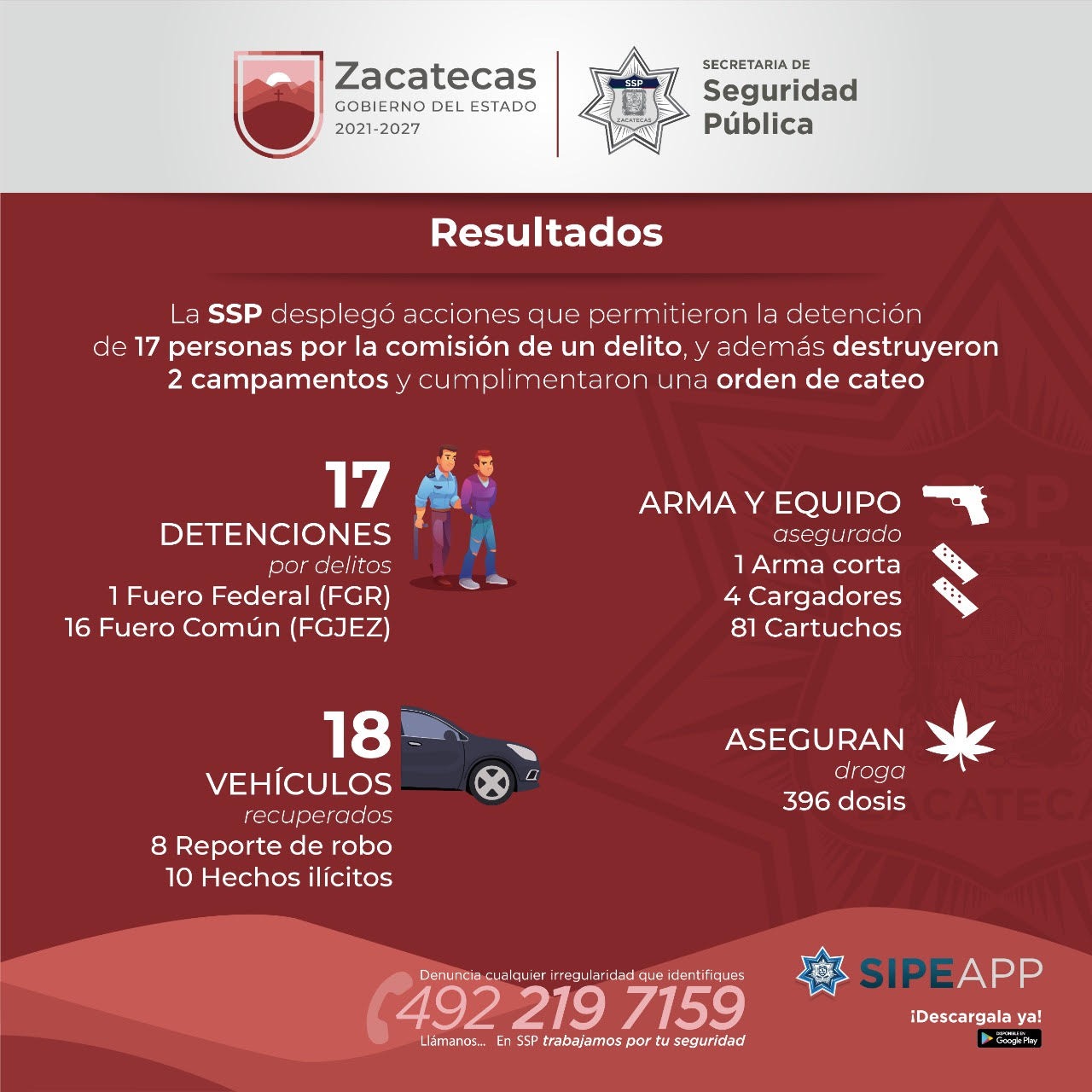 Zacatecas, Zac.-La Mesa de Construcción de Paz, encabezada por el Gobernador David Monreal Ávila, en una semana logró la detención de 17 personas por la probable comisión de un delito, con lo que se avanza en el cumplimiento de poner en el centro de las familias zacatecanas el bienestar social y el orden público.