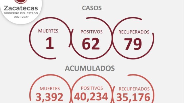 Zacatecas registra hoy 62 nuevos casos de COVID-19, para alcanzar un acumulado de 40 mil 234 confirmados; así como 79 zacatecanos recuperados de la enfermedad y un deceso, de acuerdo al reporte de la Secretaría de Salud de Zacatecas (SSZ).