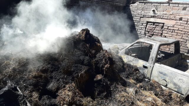 El incidente ocurrió en el corral del domicilio, donde se tenía almacenada una cantidad importante de pacas de avena que repentinamente comenzaron a arder, alcanzando un vehículo Chevrolet tipo pick-up, del que se reporta pérdida total.