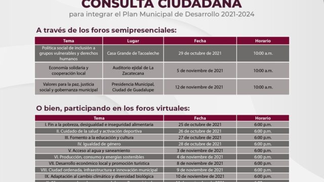 A estos foros están convocados todas y todos los guadalupenses, representantes de organizaciones públicas, privadas o de la sociedad civil interesados en participar en la consulta ciudadana para la formulación del Plan Municipal de Desarrollo 2021-2024.
