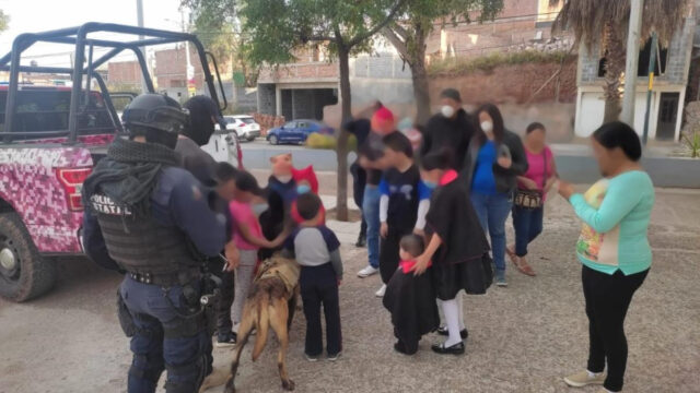 Elementos de la Policía Estatal y la Metropolitana, al realizar acciones propias de seguridad, aprovecharon sus recorridos de vigilancia para promover la cercanía con la sociedad; así, como parte de las tradiciones mexicanas, en el marco del Día de muertos, entregaron dulces a las y los niños que se encontraban por la calle.