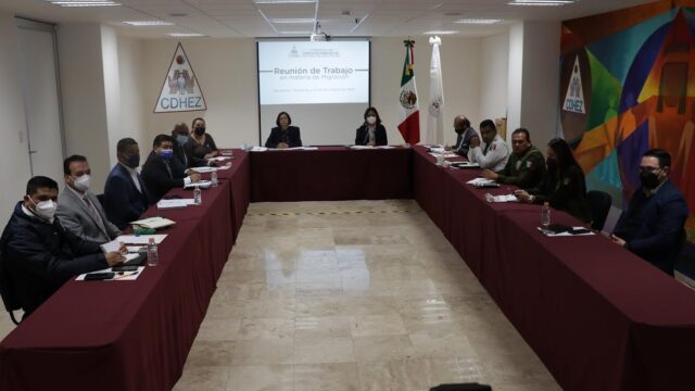 Zacatecas, Zac.- La Comisión de Derechos Humanos del Estado de Zacatecas (CDHEZ) y la Comisión Nacional de los Derechos Humanos (CNDH) se reunieron con autoridades estatales, federales, cónsules, representantes de la Organización Internacional para las Migraciones (OIM), así como de la Agencia de la ONU para los Refugiados (ACNUR) con el propósito de abordar la política y prácticas administrativas en materia de migración que se realizan en la entidad, por ser un lugar de tránsito de personas migrantes.