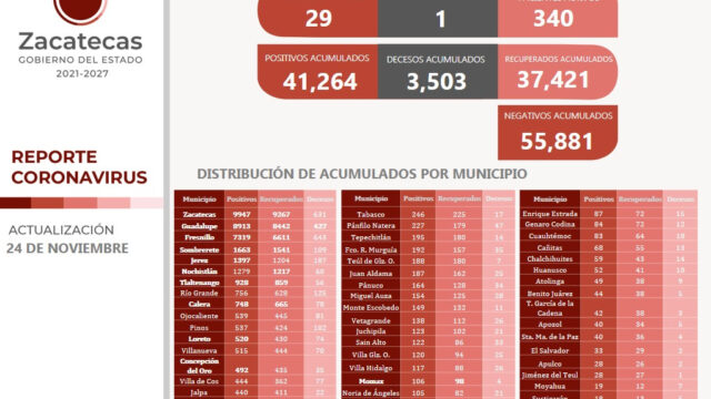 Zacatecas, Zac.- Este miércoles, el reporte de las autoridades estatales de salud respecto a la pandemia por COVID-19 indica que hay 29 nuevos contagios, 16 recuperados y un deceso a causa de complicaciones por el virus, con lo cual, las cifras de acumulados son de 41 mil 264; 37 mil 421 y 3 mil 503, respectivamente.