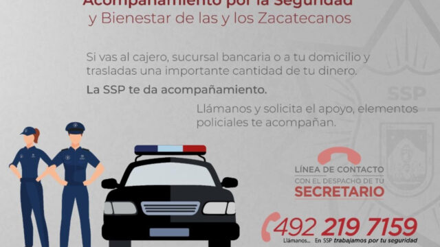 Zacatecas, Zac.-En el marco del programa de Acompañamiento y Bienestar por las y los zacatecanos, que implementó el Gobernador David Monreal Ávila, integrantes de las corporaciones de la Secretaría de Seguridad Pública (SSP) brindan acompañamiento a cuentahabientes para que realicen retiros y traslados de grandes cantidades de dinero de manera segura.