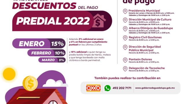 Además, también es posible pagar en las cajas de la Alberca Olímpica de Guadalupe, de la Dirección de Seguridad Pública Municipal, del Instituto Municipal de Cultura, de la Oficialía 2 del Registro Civil y en el Panteón de Dolores.