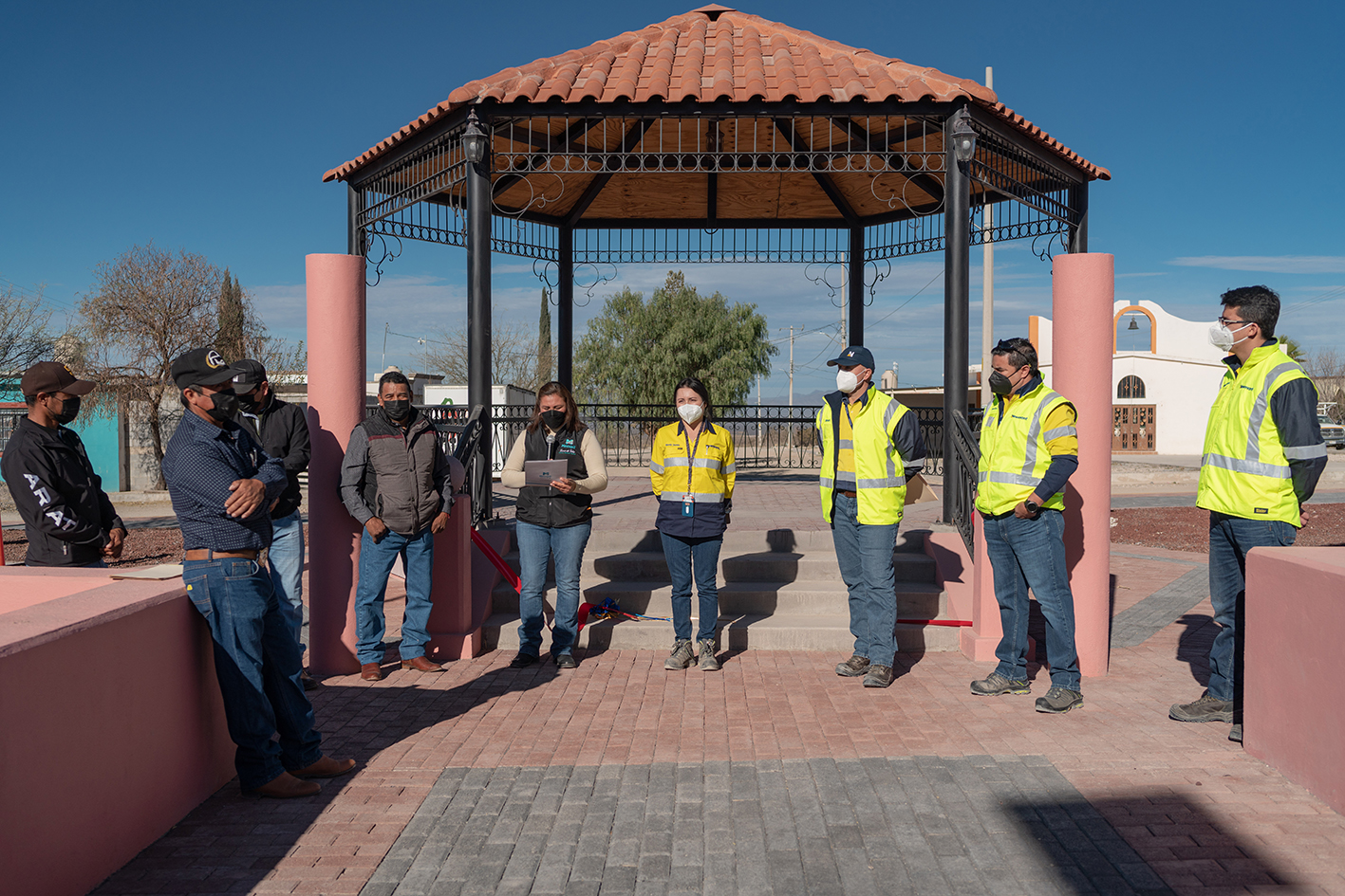 Mazapil, Zac.- Como parte del compromiso que tiene Newmont Peñasquito de crear valor compartido en las comunidades de su zona de influencia, entregó a los habitantes de la comunidad de Nuevo Peñasco, perteneciente al Ejido Cedros en el municipio de Mazapil, la remodelación y rehabilitación de su plaza.